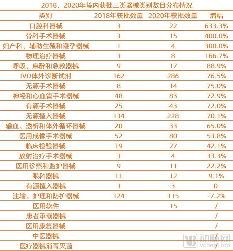 獲批產(chǎn)品類別方面,對(duì)比2018年和2020年全年境內(nèi)三類器械的獲批狀況可以發(fā)現(xiàn),在這兩年時(shí)間里,口腔科器械、骨科手術(shù)器械、婦產(chǎn)科、輔佐生殖和避孕器械、物理治療器械、呼吸、麻醉和急救器械的獲批數(shù)量增幅位列前五位,但同時(shí)這五類獲批數(shù)量均處于較低水平。
